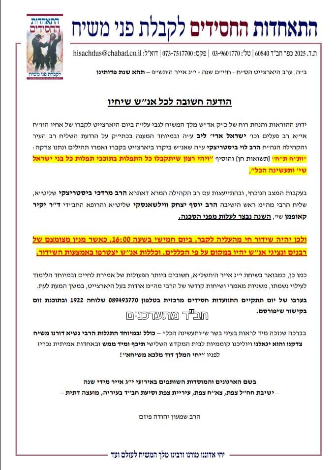 סדר ההנהגה די"ג אייר, יארצייט הריא"ל, לאור המצב. על פי הנחיית המד"א הרב ביסטריצקי