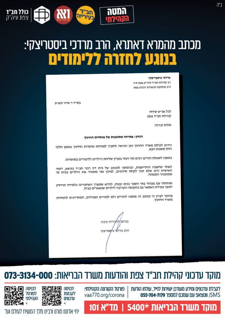 להלן 2 המכתבים שיצאו ע"י המטה הקהילתי השבוע, מהמד"א הרב ביסטריצקי.