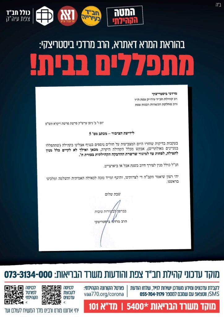 מצורף מכתבו של המד"א הרב ביסטריצקי שיחי' בו הוא קורא לא לקיים מניינים כלל, ולהתפלל כל אחד בביתו.