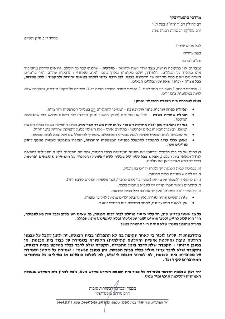 מכתב הרב י"ב סיון (4/6) – בתי כנסת והתנהלות